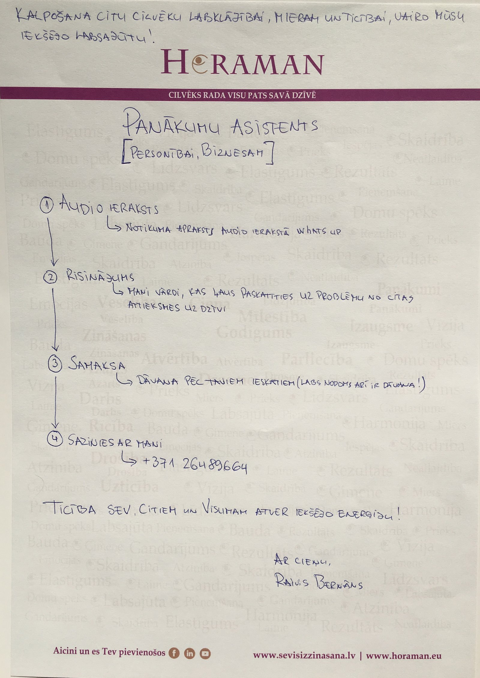 Izskaidro savu dzīves situāciju, lai dzirdu Tavu balsi, vārdus, attieksmi un izpratni par notiekošo un mēs kopā atradīsim izeju no šīs dzīves situācijas, trenējot iekšējo disciplīnu prātam. Panākumu būtība ir izmainīt savu domāšanas veidu, lai apkārt notiekošo spētu uztvert kā ieguvumu savai apziņas izaugsmei, pārvarot pretestību iekšējā balsī, mēs spējam ievērot likumsakarības, kas notiek ar mums katru dienu!
